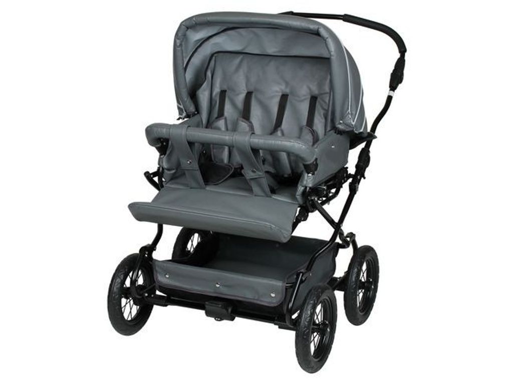 Barnvagn med grått skal utan PVC, enkel att rengöra. Vagnen har en avtagbart solskydd och en sittdel som kan vändas, samt en stor avtagbar förvaringskorg med gott om plats till förvaring. Ryggstödet kan justeras till viloläge (men kan inte läggas helt platt). Dessutom har vagnen en fällbar båge och justerbart fotstöd. Däcken är avtagbara och har kullager. - Mått: 118 x 78cm - Dimension: 96cm liggande - Höjd: 71 - 109cm