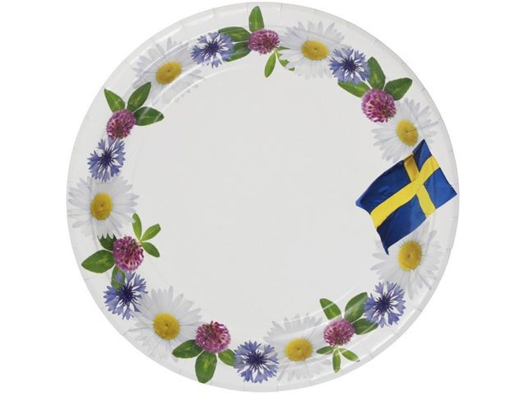 Sommar, sommar, sommar! Här har vi en riktigt somrig papperstallrik för att duka upp med en härlig sommarkänsla! En sommarpapperstallrik som passar lika bra till utomhuslunchen, examen eller till findukningen på kontoret. Med prästkrage, klöver, blåklint och den svenska flaggan fångar detta verkligen den svenska sommaren, på en tallrik! - 23cm - FCS-godkänd - Livsmedelsgodkänd