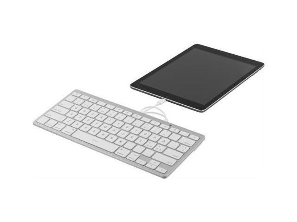 Smidigt tangentbord som är anpassat för iOS-enheter med lightning-anslutning. Har du tex. en iPad Air så kopplar du in kabeln i enheten och allt är klart för användning direkt. Obs! för att säkerställa att tangentbordet ger åäö samt @ tecknet vid användning, gå till: inställningar, allmänna, tangentbord, där bör du ha ett val för 'fysiskt tangentbord', se till att det är inställt på Swedish - Pro (Svenska - Pro). För femte generationens 9.7' iPad med SIM-kort kan det ta lite längre tid för surfplattan att känna igen tangentbordet, prova då att vända på kontakten eller vänta i 20 sekunder. Med alla andra iPads, exempelvis sjätte generationens iPad 9.7' från 2018 fungerar tangentbordet utmärkt. - Nordisk layout - 0,4 meter kabel - Anpassade tangenter för användning i iOS - Passar alla iOS-enheter med lightning-anslutning - Vikt: 286g - Mått (BxDxH): 286x120x23mm - Färg: Vit/silver