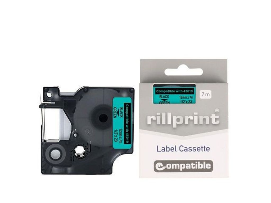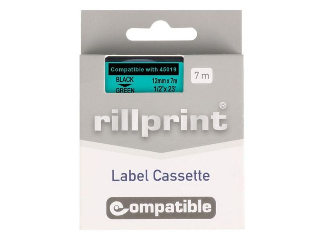 Beskrivning av Tape 12mm svart på grön Självhäftande polyestertejp för snabb och enkel applicering Tape 12mm Svart på Grön - Består till 67% av återvunnet material