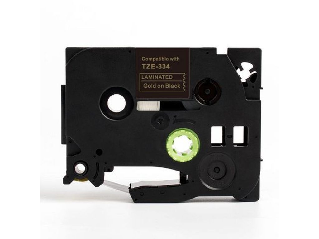 Tape 12mm TZe-334 Guld på Svart. TZ-tejper tål kraftig nötning och långvarig exponering för elementen - Mått: 12 mm x 8 m - Färg: Guld text på svart botten - Kompatibla med: P-Touch PT-1000, 1005, 1010, 1080, 1090, 1100, 1170, 1180, 1190, 1230, 1250, 1260, 1280, 1290, 1400, 1600, 1650, 18, 1830, 1850, 1880, 1950, 1960, 2030, 2100, 2110, 2420, 2430, 2460, 2470, 2480, 2700, 2710, 2730, 7100, 7500, 7600, 900, 9500, 9700, 9800, D200, E300, PT-GL-100, PT-H100, H105, H30 - Innehåller inte PVC