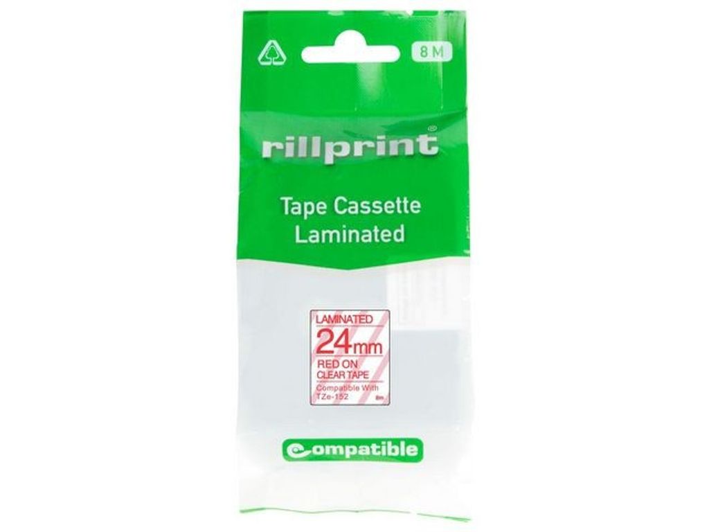 Tape 24mm TZe-152 Röd på Klar. TZ-tejper tål kraftig nötning och långvarig exponering för elementen - Mått: 24 mm x 8 m - Färg: Röd text på klar botten - Kompatibla med: P-Touch PT-1400, 1600, 1650, 2400, 2430, 2700, 2710, 550, 7500, 7600, 9500, 9700, 9800 - Innehåller inte PVC