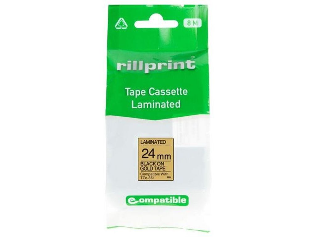 Tape 24mm TZe-851 Svart på Guld. TZ-tejper tål kraftig nötning och långvarig exponering för elementen - Mått: 24 mm x 8 m - Färg: Svart text på guld botten - Kompatibla med: P-Touch P-Touch Cube, PT-D600VP, PT-D800W, PT-E550WVP, PT-H500, PT-P700, PT-P750W, PT-P900W, PT-P950NW, PT-2420PC, PT-2430PC, PT-2470, PT-2480, PT-2730VP, PT-3600, PT-7500VP, PT-7600VP, PT-9600, PT-9700PC, PT-9800PCN, PT-P750TDI - Innehåller inte PVC
