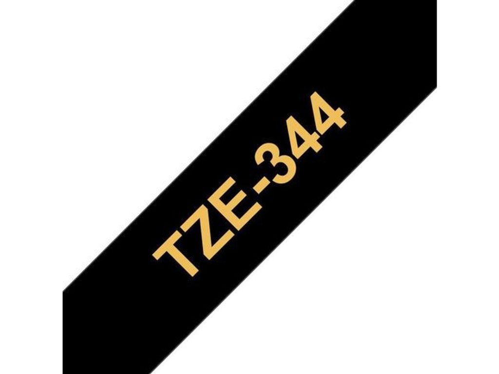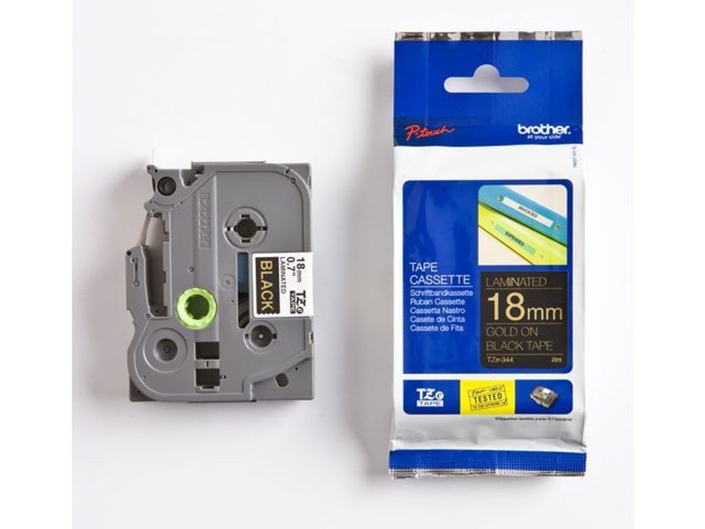 TZe344 etikettape fungerar perfekt med Brother P-touch märkmaskiner. Den laminerade, guld på svart, tapen är lätt att läsa och passar för märkning i hemmet, på kontoret eller andra arbetsplatser. - Brother TZe344 etikettape - Guld text på svart botten - 18 mm
