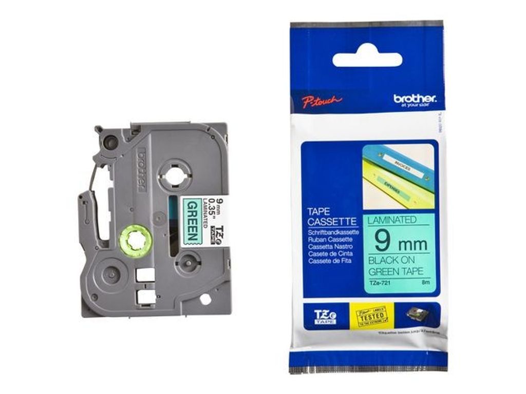 TZe721 etikettape fungerar perfekt med Brother P-touch märkmaskiner. Den laminerade, svart på grön, tapen är lätt att läsa och passar för märkning i hemmet, på kontoret eller andra arbetsplatser. - Brother TZe721 etikettape - Svart på grön - 9 mm