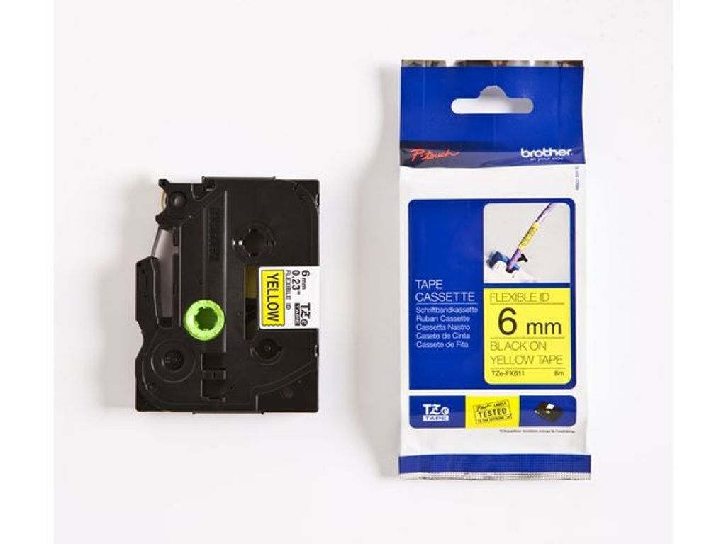 Beskrivning av Tape BROTHER TZEFX611 6mm svart på gul TZ-tejper tål kraftig nötning och långvarig exponering 6 mm flexibel tape, svart text på gul botten, laminerad, längd 8 m. - Längd: 8 m - Bredd: 6 mm - Färg: Svart på gul