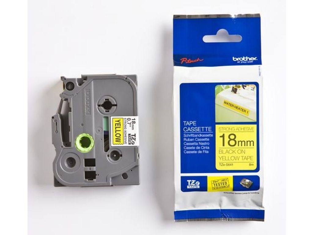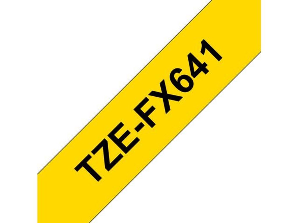 Perfekt för att skriva ut märketiketter för kablar, ledningar, PVC-rör eller vad som helst som är cylindriskt. Det speciella häftämnet på Brother TZeFX641 tape, svart på gul, säkerställer att dina viktiga etiketter sitter kvar länge. Kompatibelt med P-touch-märkmaskin som har TZ- eller TZe-logotypen på kassettkåpan. - Brother TZeFX641 tape - Svart på gul - 18 mm