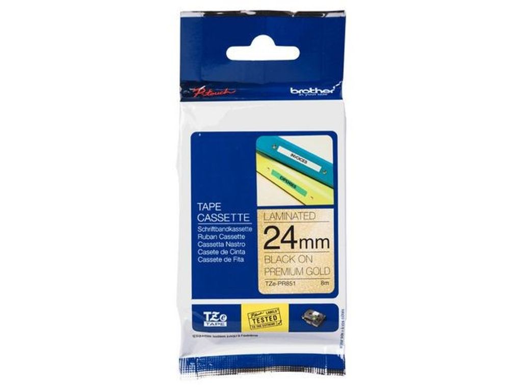 TZ-tejper tål kraftig nötning och långvarig exponering Brother original TZe-PR851 är en exklusiv premiumtape med svart text på glittrig guldbakgrund. Använd tapen för att skriva ut stilfulla placeringskort till bröllop eller dop. Tapen är också perfekt för att märka kort till buffébord på ett stilfullt sätt. Vill du ha din gåva skall bli ihågkommen? Använd premiumtape för att skriva ut personliga gratulationer till din present. Den laminerade tapen garanterar att dina etiketter skyddas mot skador. Kompatibel med P-touch-etikettskrivare som visar TZ- eller TZe-logotypen på kassettkåpan. - Svart på glittrade guld - 24mm bred, 8 m lång - Brother originaltape av högsta kvalitet - För placeringskort, personliga gåvor och pyssel