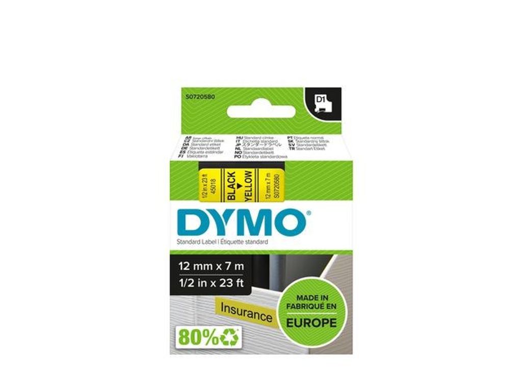 DYMO D1-etiketter erbjuder den prestanda och omväxling du behöver för alla typer av märkning, både inomhus, utomhus, på kontoret, i verkstaden, i butiken eller någon annanstans. Etikettkassetten DYMO® D1 på 12 mm ger snygga, skräddarsydda etiketter med svart text på gul botten som är snabba och enkla att användas både inomhus och utomhus. D1-tejp med text som har skrivits ut med termisk överföringsteknik – varken bläck eller toner behövs. Dessa tåliga och hållbara etiketter är vattentåliga, UV-resistenta och de tål temperaturer mellan -18 och 90 °C. De fäster på nästan alla släta och rena ytor inklusive plast, papper, metall, trä och glas. Den självhäftande tejpen är även löstagbar för kortsiktig märkning utan limrester. - Kompatibla med: DYMO® LabelMANAGER 160, 210D, 210D-sats, 210D-satsfodral, 280, 360D, 420P, 420P-sats, 500 TS, PnP - Självhäftande polyestertejp med snabb och enkel applicering - Färg: Svart text på gul botten - Inkluderar: 1 rulle - Mått: 12 mm x 7 m - Etiketterna kan tas bort utan att lämna kvar limrester - Fäster på nästan alla rena, släta ytor inklusive plast, papper, metall, trä och glas - Ta enkelt bort skyddsfilmen för snabb och enkel applicering - Vattentåligt - UV-resistent - Temperaturbeständiga - Består till 45% återvunnet material -