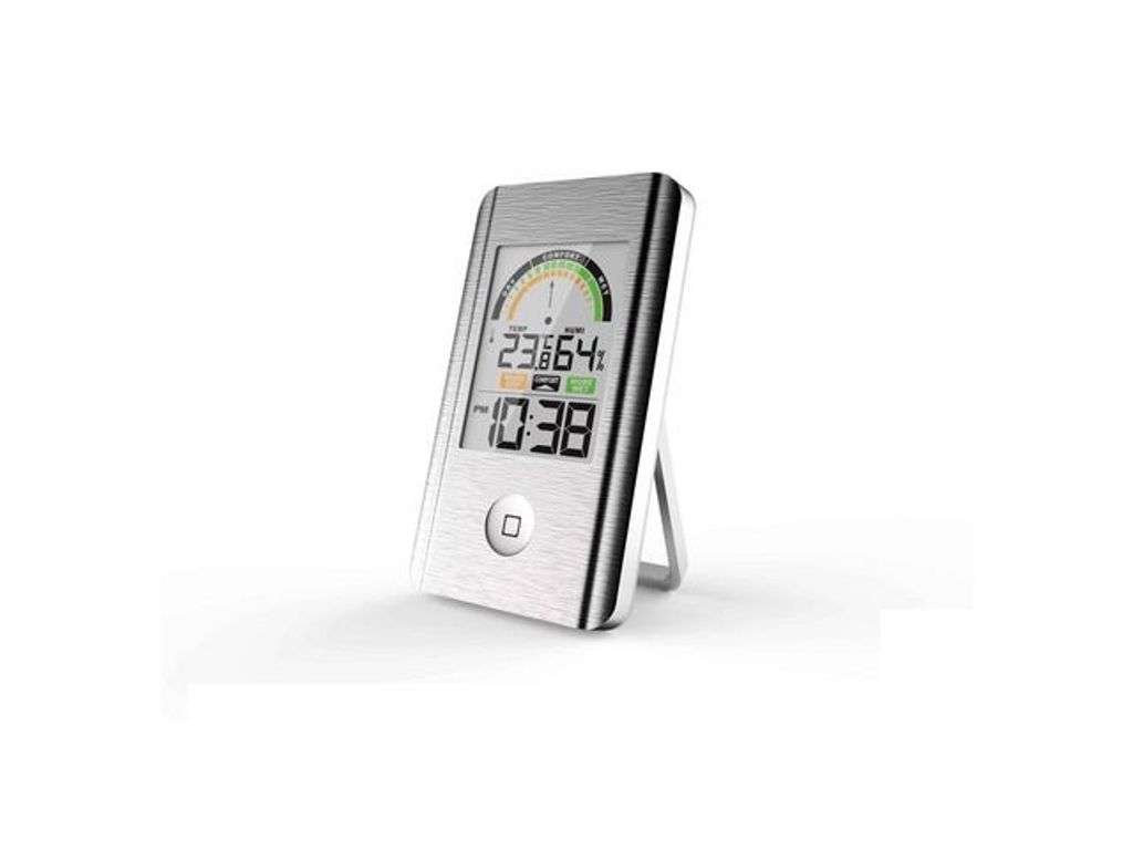 Digital termometer och hygrometer samt klocka för inomhusbruk. Kan hängas på väggen eller placeras med hjälp av det utfällbara bordsstativet. Visar temperatur, luftfuktighet, klocka samt indikator med komfortzoner i olika färger. Allt man behöver för ett trevligt inomhusklimat. - Metallfront av borstad aluminium - Mätområde temperatur: –10 till +60C - Mätområde luftfuktighet: –10 till 99% - Drivs av 2st LR03/AAA batterier. (medföljer ej)