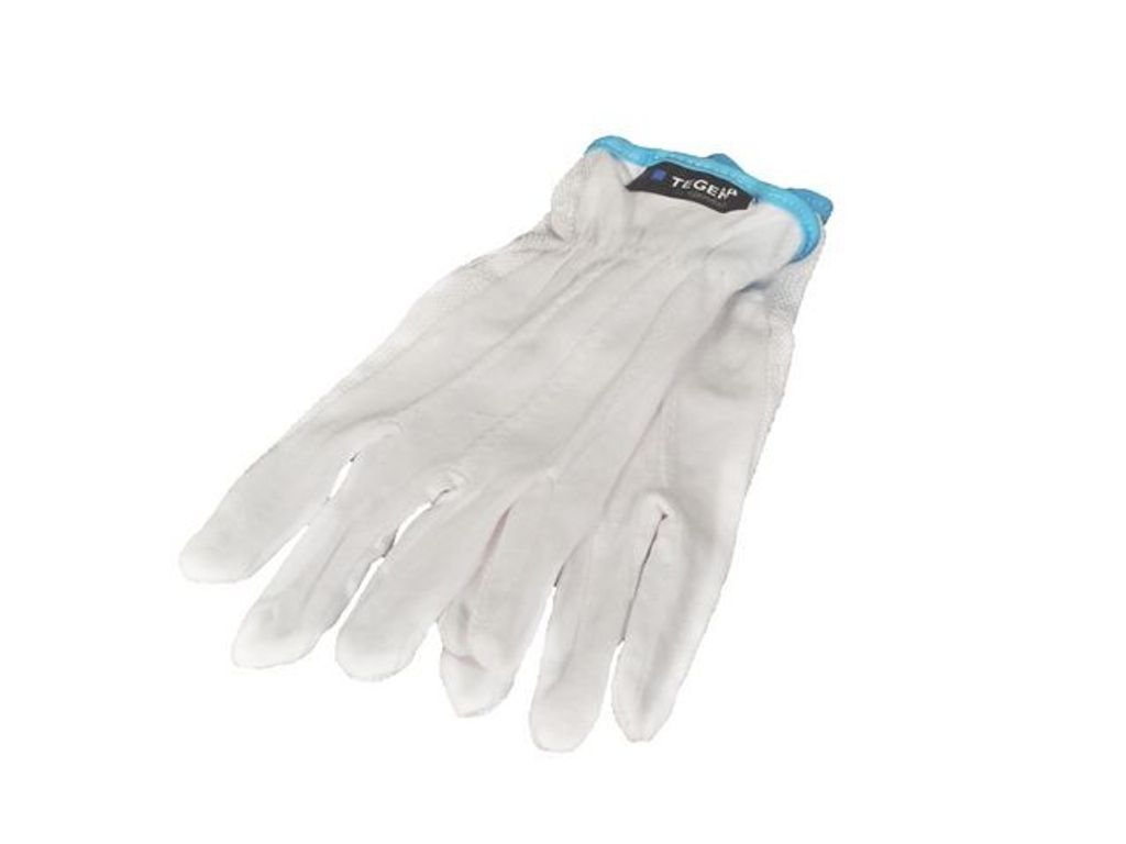 Bomullshandske med Ftalatfria PVC (vinyl)-prickar. Passar utmärkt för monteringsarbeten. Handskarna är mjuka och passar i rena, torra miljöer. Motverkar risken för blåsor, skrubbsår och kontakt med smuts. Huvudsakliga användningsområden innefattar bland annat köksarbeten, montering, underhåll, trädgårdsarbeten, lokalvård, omsorg, mathantering, butiksarbeten, lager, hotell- och restaurang, pappersindustri, servicearbeten, maskinoperatör. - Storlek: 10 - Färg: vit med turkos kant - Med prickar