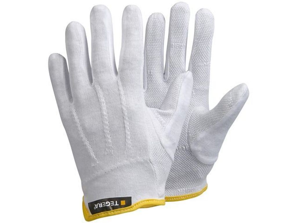 Bomullshandske med Ftalatfria PVC (vinyl)-prickar. Passar utmärkt för monteringsarbeten. Handskarna är mjuka och passar i rena, torra miljöer. Motverkar risken för blåsor, skrubbsår och kontakt med smuts. Huvudsakliga användningsområden innefattar bland annat köksarbeten, montering, underhåll, trädgårdsarbeten, lokalvård, omsorg, mathantering, butiksarbeten, lager, hotell- och restaurang, pappersindustri, servicearbeten, maskinoperatör. - Storlek: 9 - Färg: vit med grön kant - Med prickar