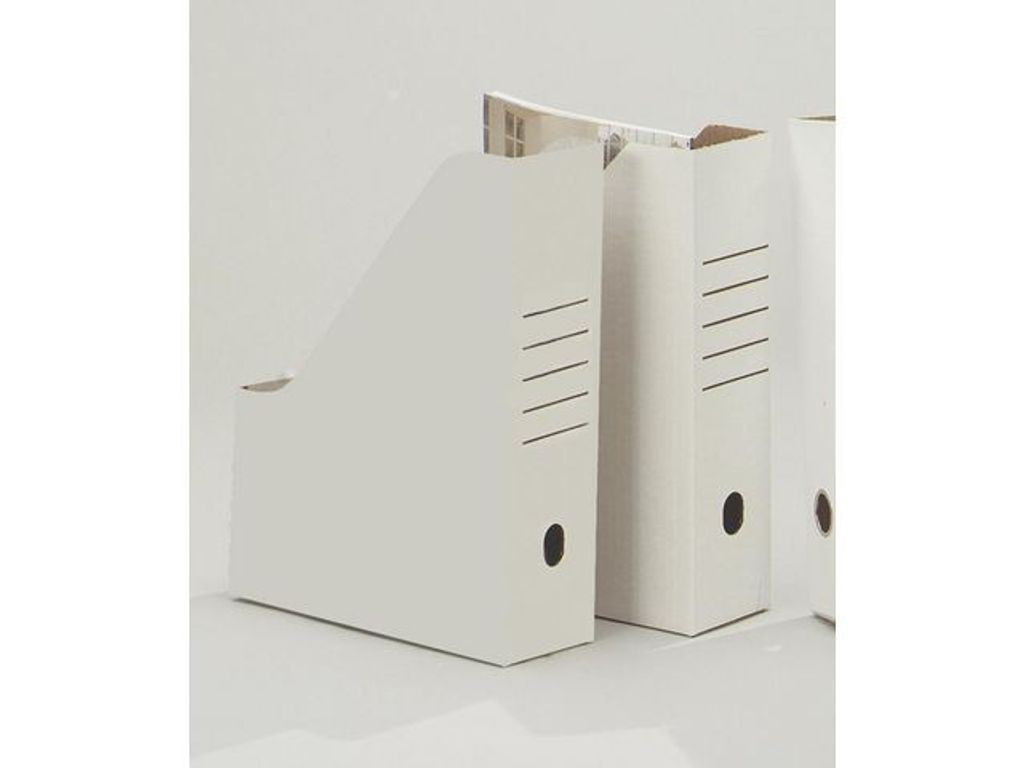 Beskrivning av Tidskriftssamlare A4 kartong vit Tillverkad av 100% returpapper, enkel att montera. Kraftig well/kartong med utstansat fingerhål. Monteras lätt. - Mått: B 80 x D 220 x H 300mm. - Tillverkad av 100% returpapper