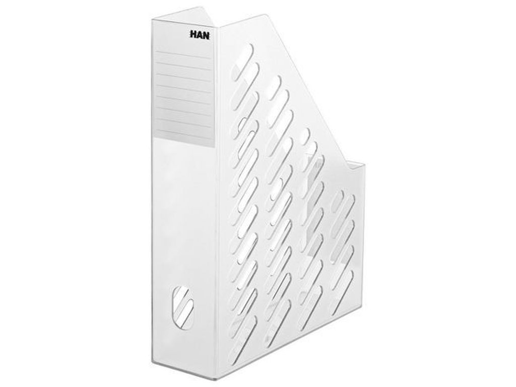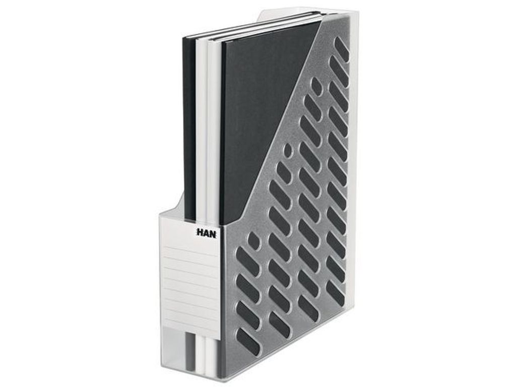 Tidskriftssamlaren KLASSIK ifrån HAN i en klassisk modern design. Med ett praktiskt fingerhål och en extra hög front håller den dokumenten säkert på plats. Tack vare dess design möjliggör den enkel visning av kataloger, broshyrer, tidsskrifter mm i sidled. - Lämplig för lagring av dokument upp till A4 / C4-storlek - Kapacitet: 70 mm - Yttermått (B x D x H): 76 x 246 x 315 mm - Framhöjd: 148 mm - Material: högkvalitativ plast, polystyren (PS) - Färg: Transparent