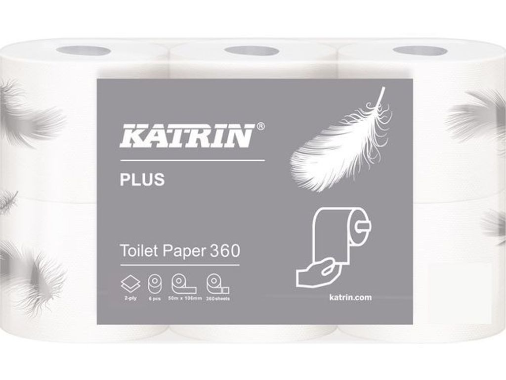Mjuka små toalettrullar av mycket hög kvalitet. Katrin Plus är vita toalettrullar som erbjuder väldigt hög komfort . När du väljer toalettrullar av Katrins högsta kvalité får du en produkt som erbjuder det lilla extra utan att ge efter på våra höga miljökrav. Lämpar sig för alla traditionella toaletthållare och är ett mycket bra miljöval. - 2-lagers, vit - Antal ark/rulle: 360 - Uppfyller: ISO 9001, ISO 14001 - Längd per rulle: 50,4m - Ark: 140 x 106mm - Diameter: 116 mm - Material: nyfiber - PEFC certifierat papper - Svanen: licensnummer 30050006