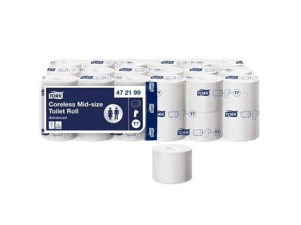 Kompakta Mid-size-rullar: en rulle motsvarar 4-5 vanliga toalettpappersrullar. Tork Dispenser Coreless Mid-size Twin Toalettpapper passar perfekt för toalettutrymmen med medelhög trafik, där kundnöjdheten står i centrum. Den har plats för två medelstora toalettpappersrullar som garanterar hög effektivitet och att toalettpapper alltid finns tillgängligt. Tork Coreless Mid-size Toalettpapper i Advanced-kvalitet balanserar kostnad och prestanda på ett effektivt sätt. Snygg dekor: utformad för att skapa ett gott intryck. - 2-lagers, vit - Advanced-kvalitet - System: Toalettpapper Mid-sizeTwin utan hylsa T7 - Rullängd: 103,5m - Rullbredd: 9.3cm - Diameter, rulle: 13.1cm - Antal ark: 900 - Arklängd: 12.5cm - Material: återvunna fiber och nyfiber - FSC-märkt - EU Ecolabel: licensnummer SE/004/001