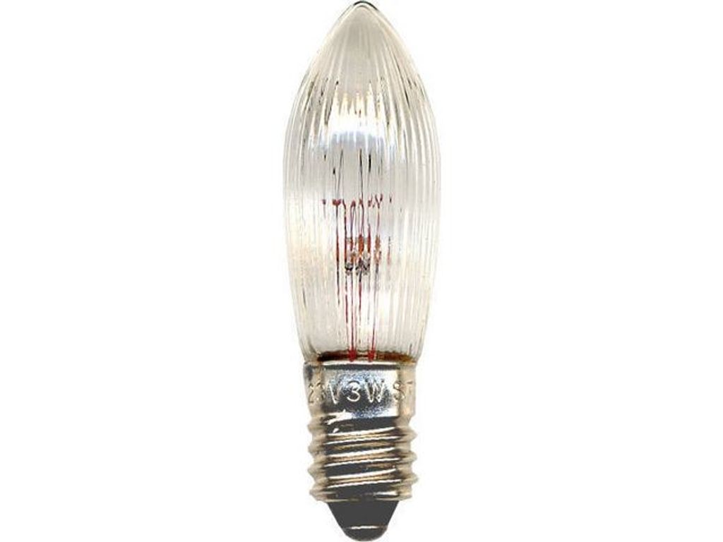 Beskrivning av Topplampa 55V 3W E10 3/fp Alltid bra med en extralampa till ljusstaken! Topplampor med E10 sockel och klart glas. Passar till 5-armade ljusstakar med stickkontakt. - 3-pack reservlampor - Inomhusbruk - Sockel: E10 - Effekt: 3W - Volt: 55V - Färg ljuskälla: Klar