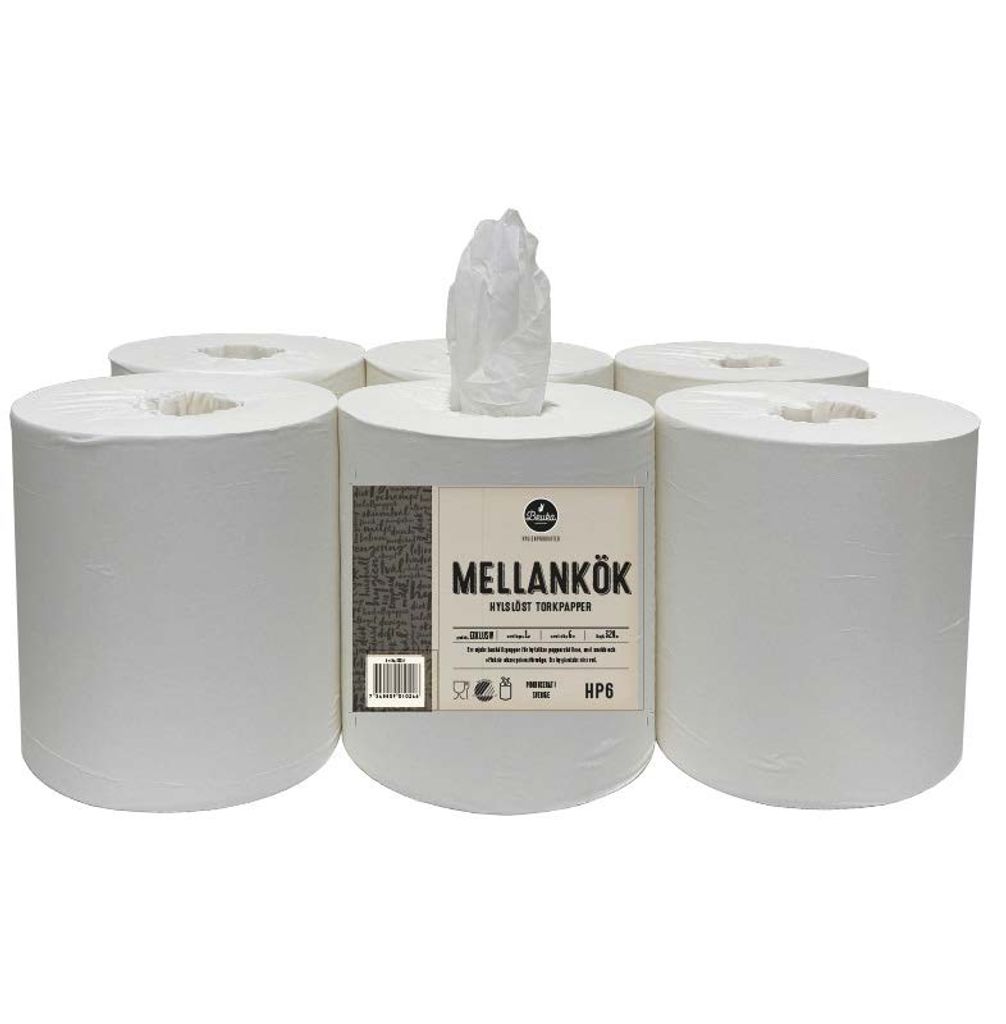 Brukas exklusiva HP6 torkpapper är ett hylslöst 1-lagers papper med många meter per rulle.