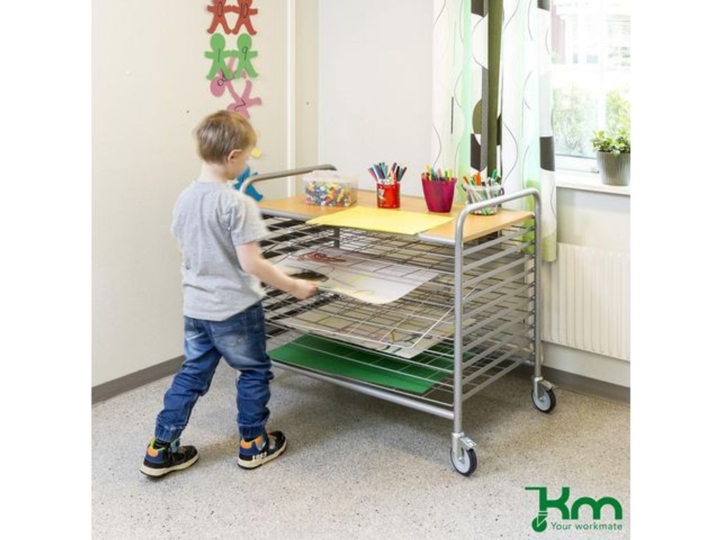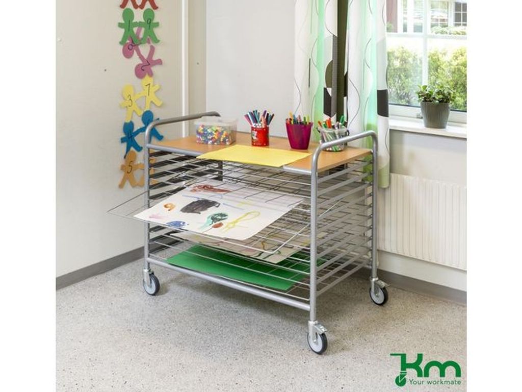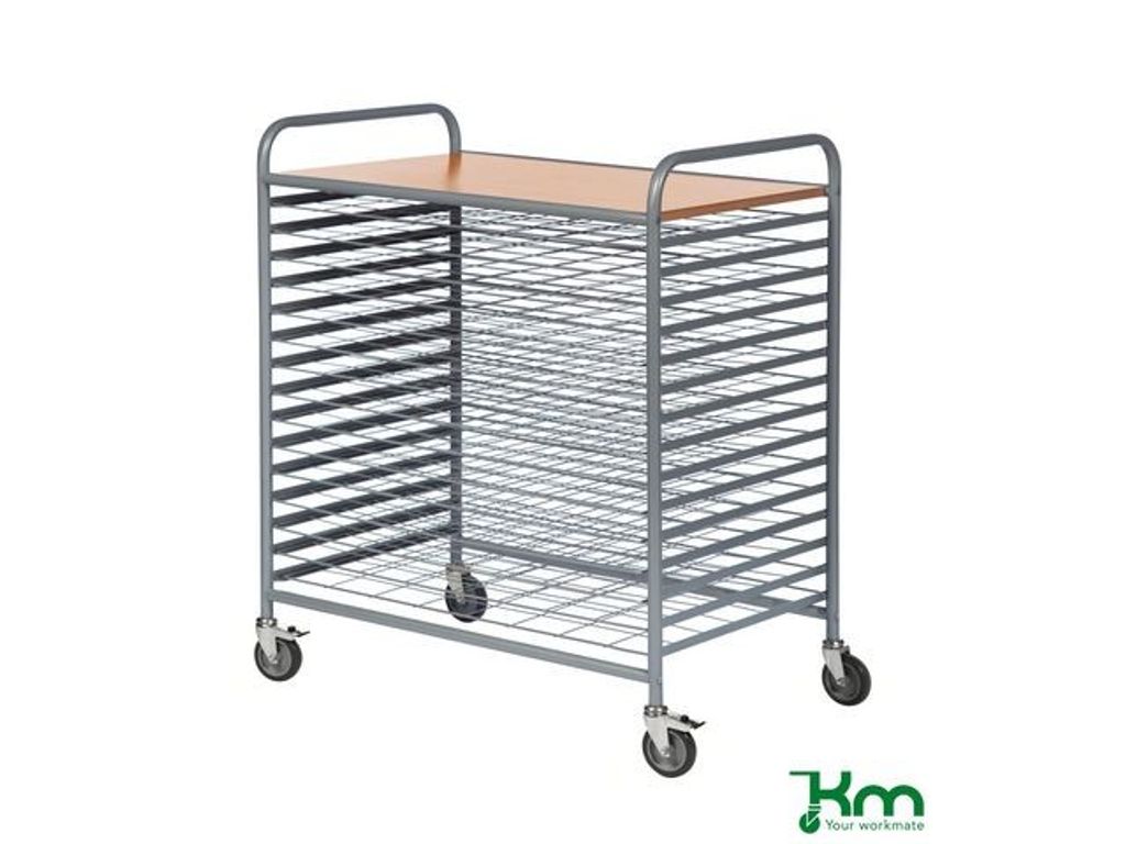 Torkvagn med utdragbara näthyllplan. Perfekta till att torka t.ex. elevernas konstverk i vattenfärg. Pulverlackad med 15 hyllplan i boklaminat. Levereras omonterad. - Belastning 100kg - Max belastning per hyllplan: 4kg - Storlek: 950 x 600 x 1120mm - Höjd till övre hyllplan: 1010mm - Avstånd mellan hyllplan: 45mm - Färg: Grå/bok - Vikt: 38kg - Bromsade hjul: Ja - Hjul: 4 länkhjul, 2 med broms 100mm