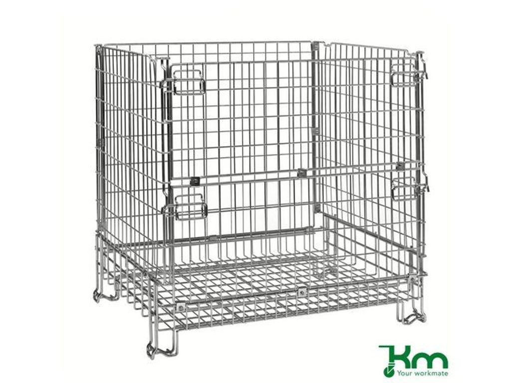 Trådkorg med öppningsbar långsida. Fälls enkelt ihop då den inte används och är praktiskt stapelbar. Halvhängd grind på långsidan. Monteras utan verktyg. - Belastning: 1000kg - Storlek: 1200 x 1000 x 1180mm (LxBxH) - Invändigt mått: 1120 x 930 x 1000mm - Nedmonterat mått: 1200 x 1000 x 330mm - Nätets maska: 65 x 120mm - Färg: Elförzinkad - Vikt: 54kg