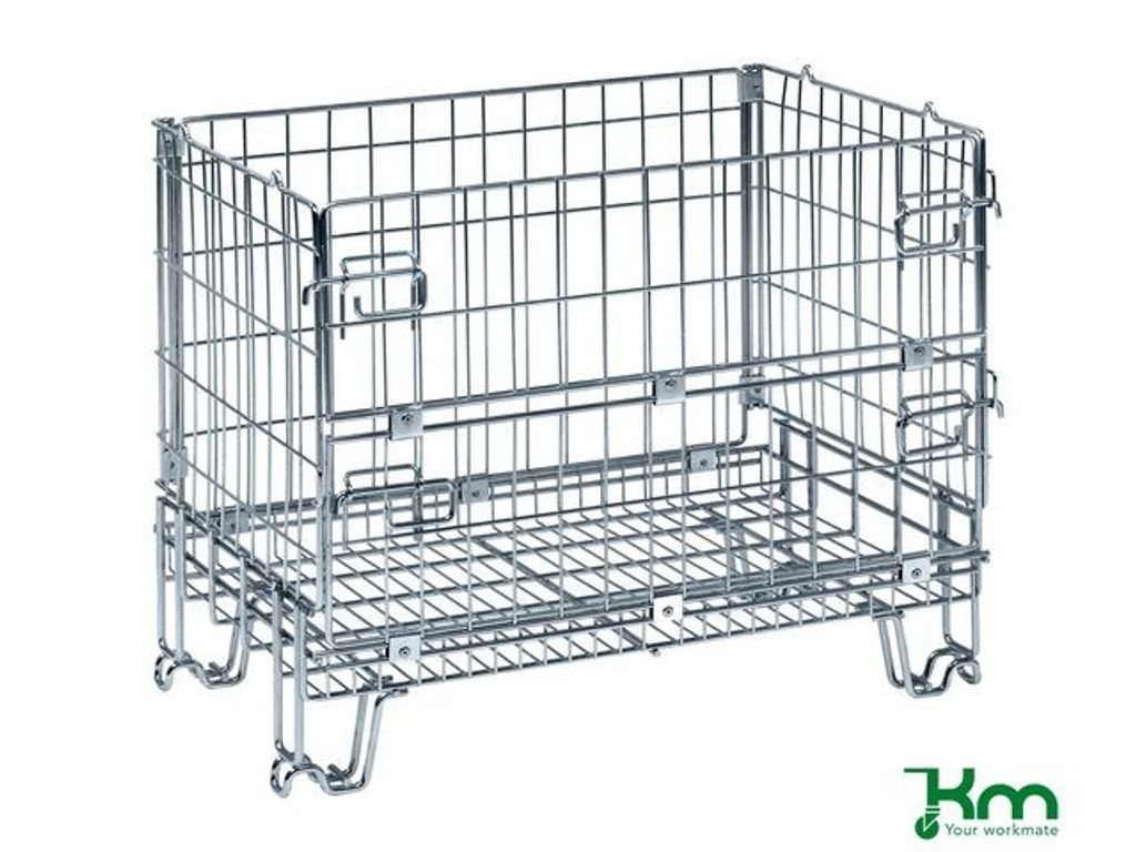 Trådkorg med öppningsbar långsida. Fälls enkelt ihop då den inte används och är praktiskt stapelbar. Halvhängd grind på långsidan. Monteras utan verktyg. - Belastning: 300kg - Storlek: 860 x 580 x 680mm (LxBxH) - Invändigt mått: 790 x 520 x 510mm - Nedmonterat mått: 860 x 580 x 240mm - Nätets maska: 50 x 100mm - Färg: Elförzinkad - Vikt: 18kg
