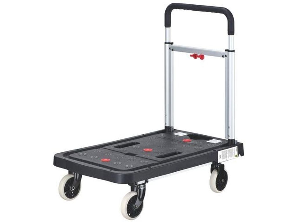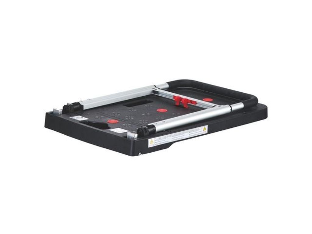 Vikbar vagn med plastplattform och metallram - 4 solida TPR-hjul, 100 mm ø på nylonfälg - 4 indragbara hjul: 2 fasta och 2 svängbara - Halkfri plattform - Plattformens storlek: 670 x 405 mm - Lastkapacitet upp till 137 kg - Antihalkgrepp, teleskopiskt handtag i aluminium - Höjd i 3 lägen: 72, 82 och 92 mm