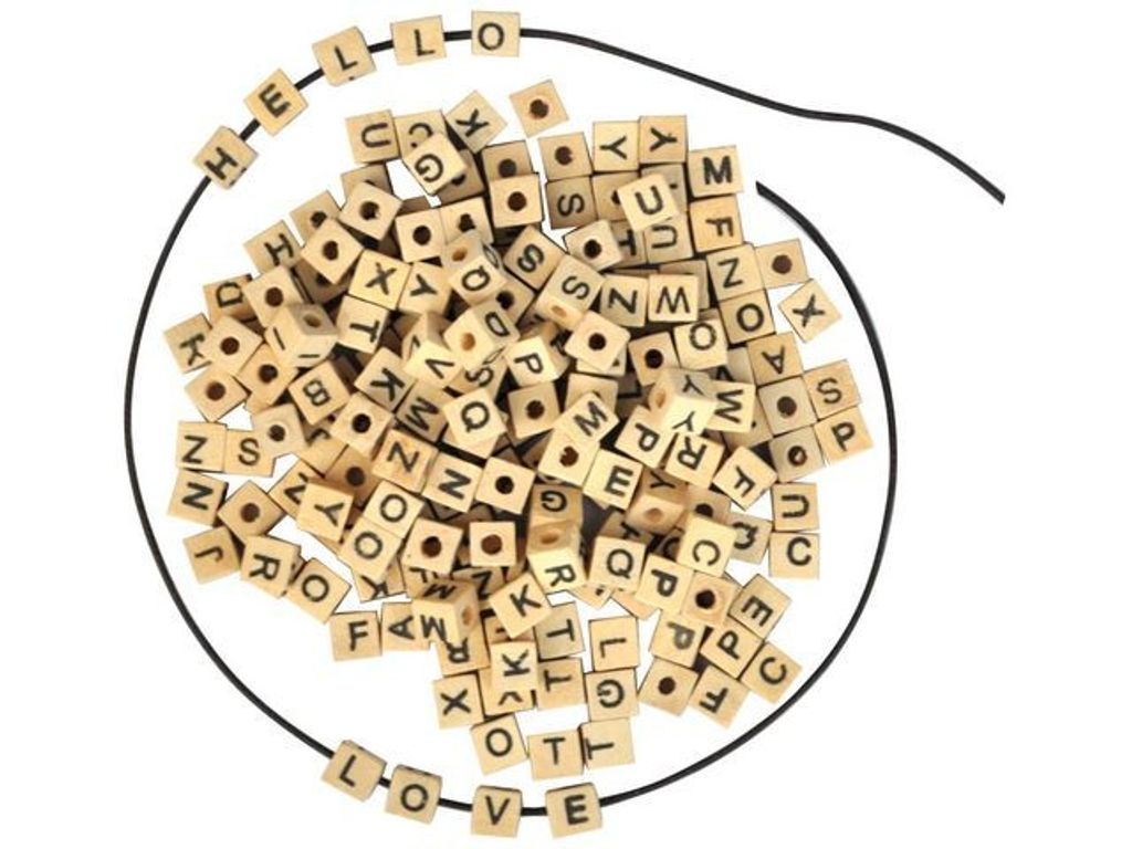 Fyrkantiga träpärlor med bokstäverna A–Ö. Att trä armband eller halsband till sig själv och andra är en rolig sysselsättning och dessutom perfekt för alla som vill öva på att läsa och skriva. - Antal: 300/FP - Mått: 7x7 mm, hål 3 mm - Material: Trä Varning. Lämpar sig inte för barn under 3 år