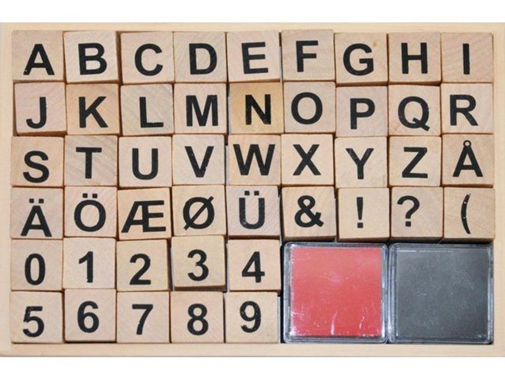 Trästämplar i form av bokstäver, siffror och specialtecken. Mycket användbara till scrapbooking eller att dekorera olika kort eller namnskyltar. - Antal: 46 st stämplar, 2 st stämpeldynor - Stämplar mått (LxBxH): 2x2x2,5 cm, material: trä med högdensitetsskum - Stämpeldyna mått (LxBxH): 4x4x1 cm