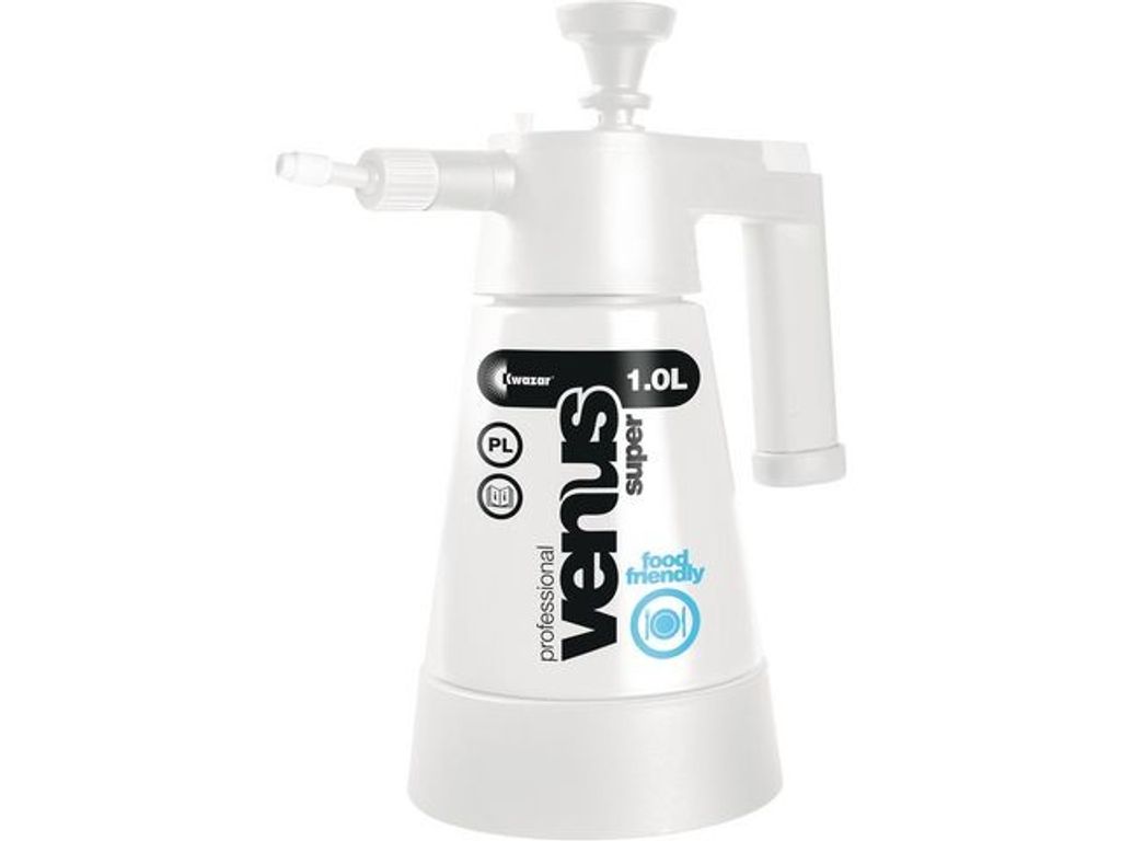 Liten vit tryckspruta som rymmer 1 liter vätska. Tryckspruta Venus Super är godkänd för användning där livsmedel hanteras. Liten och smidig tryckspruta som är lätt att bära med sig. Trycksprutan har ett böj och justerbart munstycke för anpassning efter individuella behov. Produkten har tålig silikonpackning samt är helt fri från färgämnen. Den vita sprutan rymmer 1 liter vätska. - Venus Super - Livsmedelsgodkänd - Volym: 1 liter - Färg: Vit
