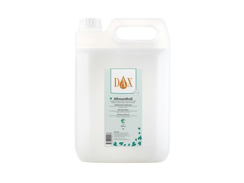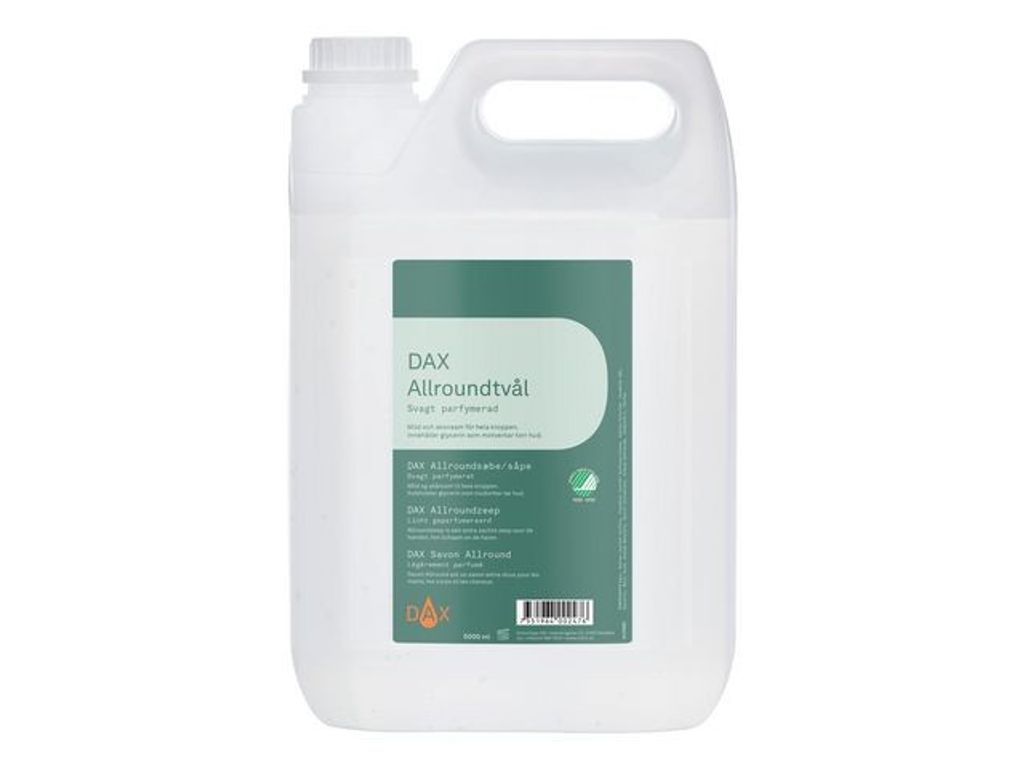 Skonsam mot huden, även vid frekvent användning, passar även till hårtvätt. Händerna utsätts för extra mycket påfrestningar när huden exponeras för kyla och frekvent tvättande med tvål och varmt vatten, så det är viktigt att välja en mild och skonsam tvål. DAX Allroundtvål är en extra mild och krämig tvål som passar för såväl kroppstvätt som hårtvätt. Rengör huden varsamt utan att torka ut och lämnar en fräsch känsla. Produkten är miljömärkt med Svanen. Allroundtvålen är kompatibel med tvåldispensrar eller används direkt från dunken och är perfekt hemma eller på kontoret. - Lätt tvål utan parabener och färgämnen - Svag parfym lämnar en fräsch doft - Volym: 5l - pH-värde: ca 4,5 - Lukt: Parfymerad - Utseende: Vit krämig - Svanen: Licensnummer 50900050