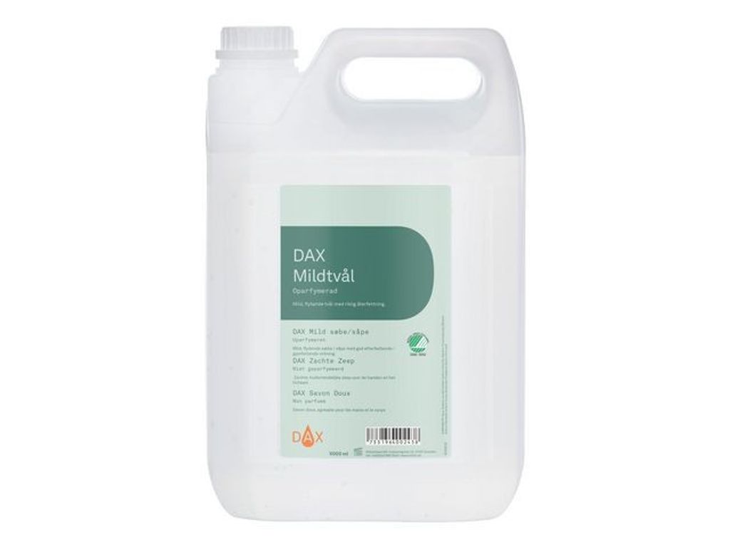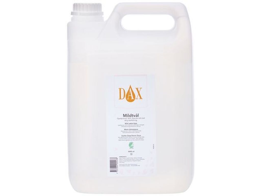 Mild tvål från DAX som är skonsam mot händerna även vid frekvent användning. Händerna utsätts för extra mycket påfrestningar när huden exponeras för kyla och frekvent tvättande med tvål och varmt vatten, så det är viktigt att välja en mild och skonsam tvål. DAX Mildtvål är skonsam för händerna och är en utmärkt tvål för den dagliga handhygienen. Tvålen rengör effektivt och varsamt samtidigt som den återfuktar huden Perfekt alternativ för kommersiella kök, offentliga toaletter eller var som helst där frekvent handtvätt krävs, och den levereras i en 5-liters dunk för att fylla på dispensrar. Regelbunden handtvätt är det bästa sättet att skydda dig själv och andra mot bakterier och virus. - Fri från färgämnen, parabener och parfym - pH-värde: ca 5 - Lukt: oparfymerad - Svanen: licensnummer 50900050
