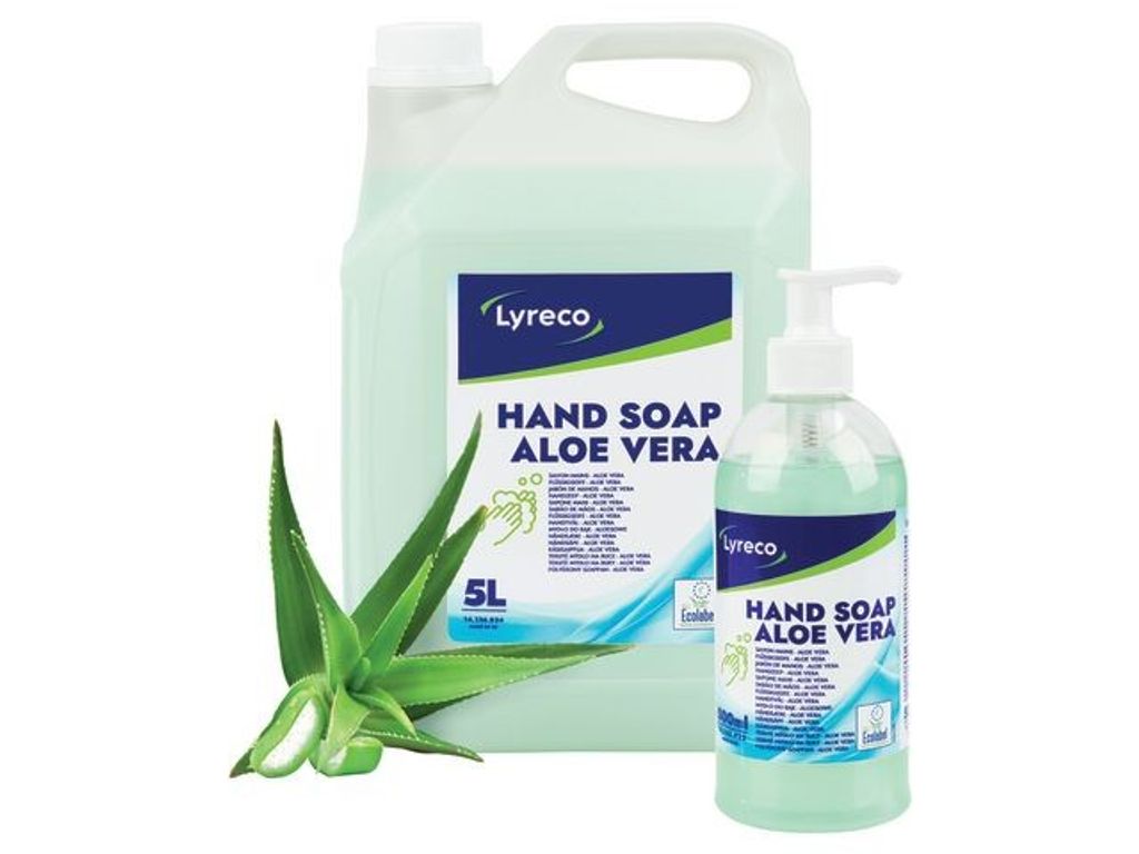 Beskrivning av Tvål LYRECO Aloe Vera 5L Miljömärkt handtvål för daglig rengöring. Flytande handtvål för daglig användning, med aloe vera-extrakt. Tvålen rengör och skyddar huden aktivt, och är behagligt parfymerad. - pH-värde: 7 - Lukt: Parfymerad - Utseende: Ljusgrön