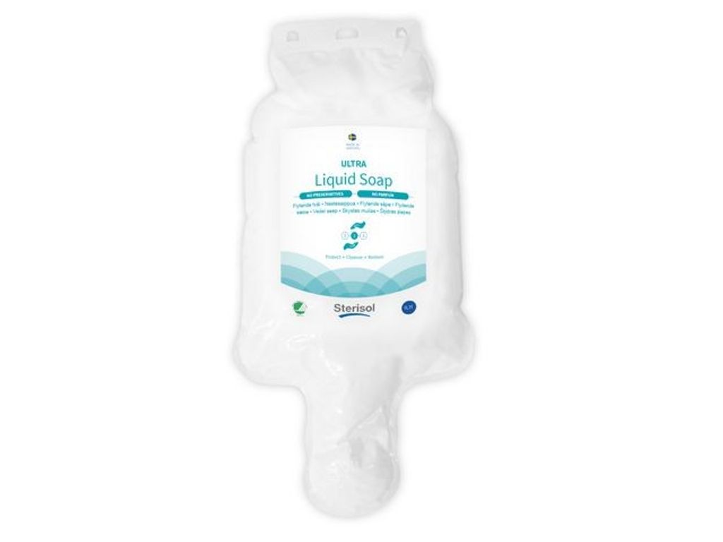 En syntetisk, mild och effektiv flytande tvål utvecklad för att även personer med känslig hud ska kunna använda den. ULTRA Flytande Tvål är ett bra val för alla miljöer och fungerar väl även med hårt vatten och vid låga temperaturer. ULTRA kan också användas som duschtvål och schampo. Den är ett perfekt val för hälsovården och livsmedelsindustrin och den ska användas på våt hud. Tvätteffekten – för industriell användning - förstärks dock när den används på torra händer. Måste användas med dispenser, annars kan läckage uppstå. - Oparfymerad - Inga färgämen - Inga konserveringsmedel - Lätt att tvätta bort - Sterisol System - Svanen: Licensnummer 30900196
