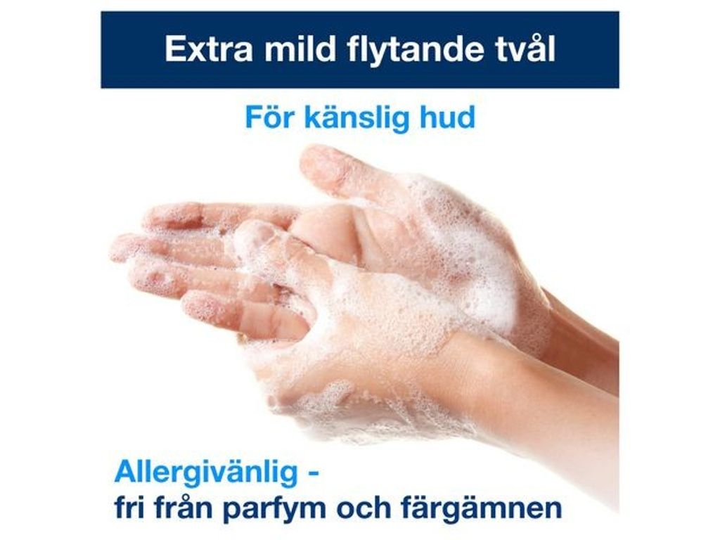 Dermatologiskt testad flytande tvål har närande ingredienser, hudvänligt pH och är allergivänlig med ECARF-certifiering, vilket innebär att den återfuktar huden och är lämplig för regelbunden användning. Ge extra vård åt torr och känslig hud med Tork Extra Mild flytande tvål. Med sina närande ingredienser och utan tillsatt parfym eller färgämnen, passar denna tvål alla hudtyper. Den är certifierad allergivänlig av ECARF (European Centre for Allergy Research Foundation). Tvålen är lämplig för användning med Tork S4-dispensrar, som är certifierade easy to use och förser alla användare med god handhygien. Rekommenderas för rejält smutsiga och kladdiga händer som kräver mer kraft vid rengöring, till exempel i kök. Bidra till att säkerställa god handhygien – den fabriksförseglade flaskan med en ny pump för varje refill minskar risken för kontaminering och skyddar innehållet tills det når händerna. - Närande ingredienser för torr och känslig hud - Extra rengöringskraft - Certifierad allergivänlig - Hygienisk, fabriksförseglad flaska med ny pump för varje refill - Flaska som krymper för 70% minskad avfallsvolym (baserat på Essity-test) - System: Tork S4 - Lukt: Parfymfri - Utseende: Vit