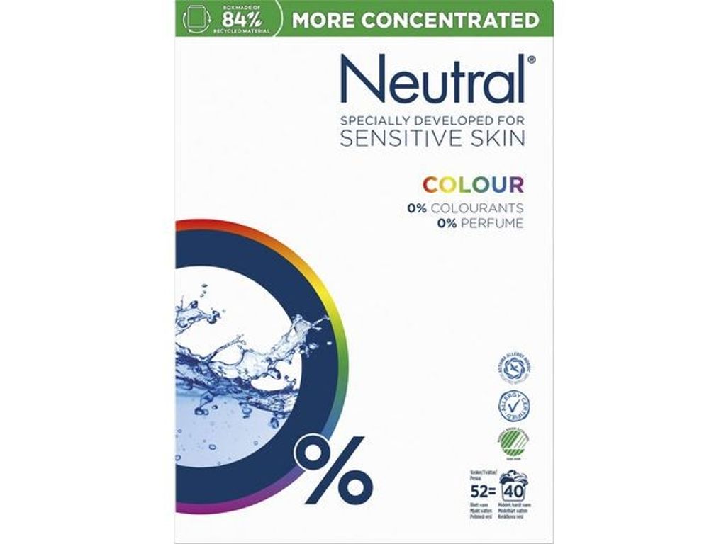 Neutral pulvertvättmedel Color är ett parfymfritt, effektivt tvättmedel särskilt utvecklat för känslig hud. Bevarar färgernas intensitet, tar bort fläckar utan att bleka. Tvättmedel NEUTRAL Color 1,95kg är ett pulvertvättmedel för kulörtvätt för känslig hud, är parfymfritt och innehåller inga färgämnen för att minimera risken för allergi och överkänslighet. Tvättar effektivt rent från smuts och fläckar genom enzymer mot proteinfläckar av t.ex. blod, svett och urin. Innehåller inte blekmedel. Alla Neutrals tvättmedel är utvecklade tillsammans med Astma- och allergiförbundet. Miljömärkt med Svanen. - pH-värde: 10,7 - Oparfymerad - Dosering: 3-5kg tvätt - Normalt smutsat: 45ml/38g (mjukt vatten), 50ml/47g (Medel), 65/61g (hårt vatten). - Hårt smutsat: 52ml/49g (Mjukt vatten), 65ml/61g (Medel), 85ml/80g (hårt vatten). - 6-8kg tvätt - Normalt smutsat: 70ml/66g (mjukt vatten), 90ml/85g (Medel), 110/103g (hårt vatten). - Hårt smutsat: 91ml/86g (Mjukt vatten), 117ml/110g (Medel), 143ml/134g (hårt vatten). - Utseende: Vitt pulver - Svanen: Licensnummer 50060145