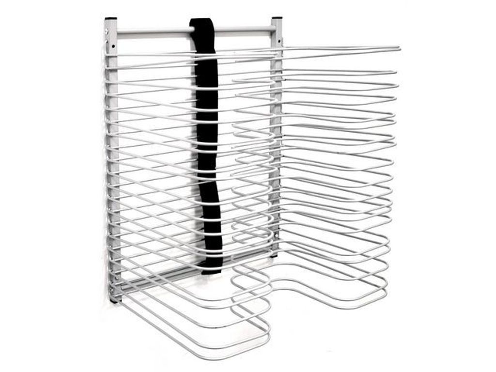 Vägghängt torkställ med 20 hyllor, där du enkelt kan lagra material ända upp till A2-format. De 20 hyllorna kan enkelt vikas upp och fästas för att spara utrymme när du inte har något att torka. Konstruerad för väggmontage. Mått: B500 x D400 x H620 mm Material: Lackerad metall