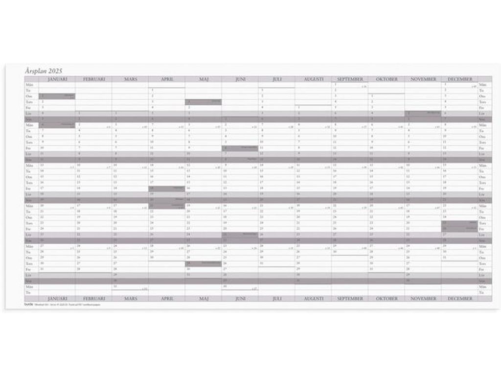 Beskrivning av Väggkalender Årsplan 2025 5/fp Kalenderblad som levereras som vikt till A4 i förpackning om 5 st. - Format: 600x297 mm. - Layout: År/Blad. - Kalendarium: 2025-01-01 - 2025-12-31. - Innehåll: Årsplan. - Antal sidor: 1. - Miljöinformation: FSC®.