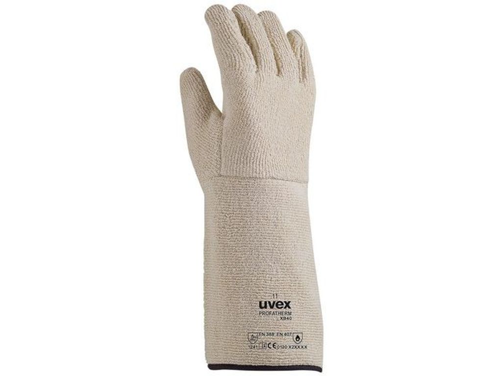 Beskrivning av Värmehandske UVEX PROFATHERM XB40 11 Fodrad värmeskyddhandske i bomullsfrotté med säkerhetskrage. Skyddar mot kontaktvärme upp till 250°C. Tål gniststänk. - Överensstämmer med EN 388-2241B, EN 407-X2XXXX - Längd: 40 cm