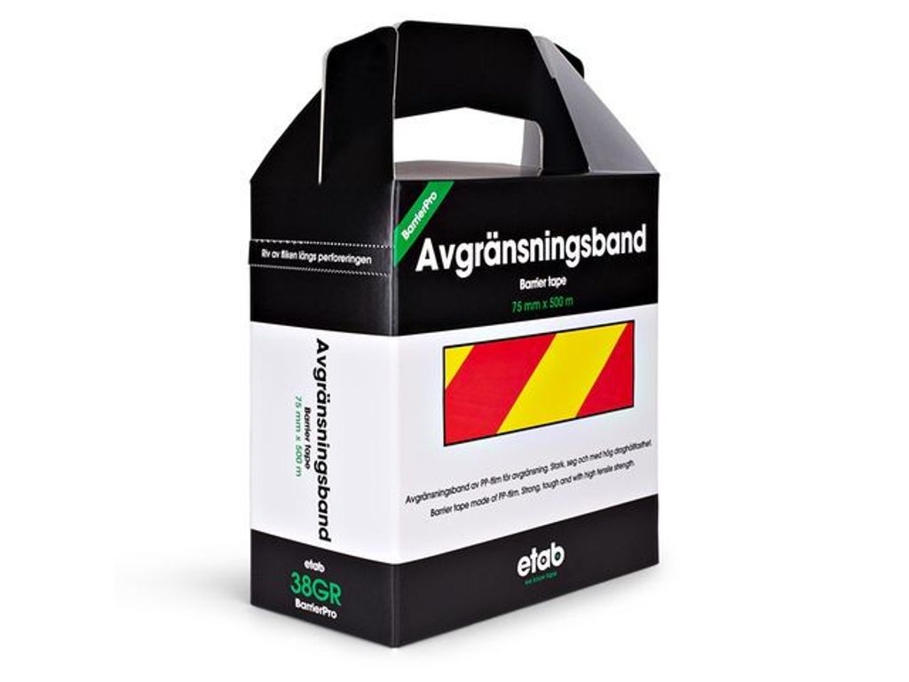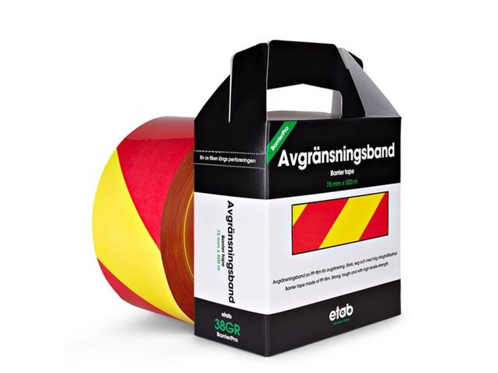 etab 38GR är ett slitstarkt avgränsningsband för att skapa en tillfällig avgränsning. Ett starkt, segt avgränsningsband med hög draghållfasthet. etab 38GR är ett slitstarkt avgränsningsband för att skapa en tillfällig avgränsning. Ett starkt, segt avgränsningsband med hög draghållfasthet. etab 38GR avgränsningsband är gjort av PP-film i gul/röd för att markera avgränsat område. Avgränsningsbandet kommer i en praktisk förpackning som även kan användas som dispenser. - Mått: 75mm x 500m