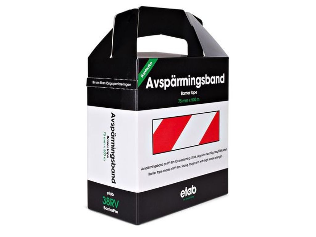 etab 38RV är ett slitstarkt avspärrningsband för att tillfälligt spärra av ett område. Ett starkt, segt avspärrningsband med hög draghållfasthet. etab 38RV är ett slitstarkt avspärrningsband för att tillfälligt spärra av ett område. Ett starkt, segt avspärrningsband med hög draghållfasthet. etab 38RV avspärrningsband är gjort av PP-film i röd/vit för att markera avspärrat område. Avspärrningsbandet kommer i en praktisk förpackning som även kan användas som dispenser. - Mått: 75mmx500m