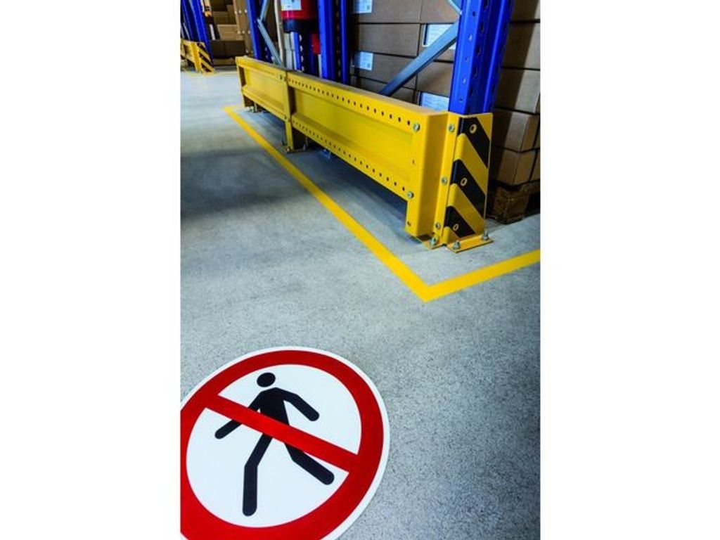 Självhäftande, stor golvdekal 'Förbjudet för gående' upplyser tydligt besökare och personal om gällande förbud för fotgängare och skapar en säkrare arbetsmiljö med minskad risk för olyckor. Varseldekal Förbjudet för gående fäster på rena och torra betonggolv. Slitstark och tålig med halkskyddsgrad R9 i enlighet med DIN 51130. Skyltarna uppfyller kraven i ISO 7010. - Mått: Ø 430 mm, tjocklek 0,4 mm