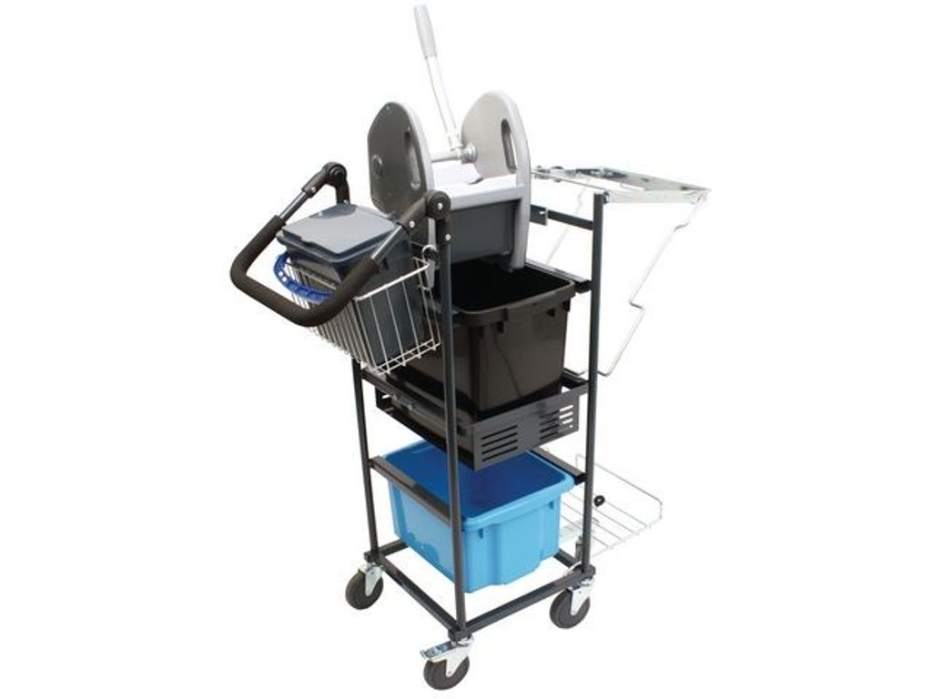 Extremt kompakt våtvagn som är enkel att hantera. Våtvagnen är färdigmonterad vid leverans. Skjutbar 15-liters plastback. Vagnen är enkel att fälla ihop. Personlig färgkombination. Reglerbart handtag. Våtvagnen har plats för 1 stativ. 6-litershink med flipplock. Liten korg + krokar. Svabbpress + 23-litershink. - Mått (LxBxH): 940x390x1020mm - Svensktillverkad