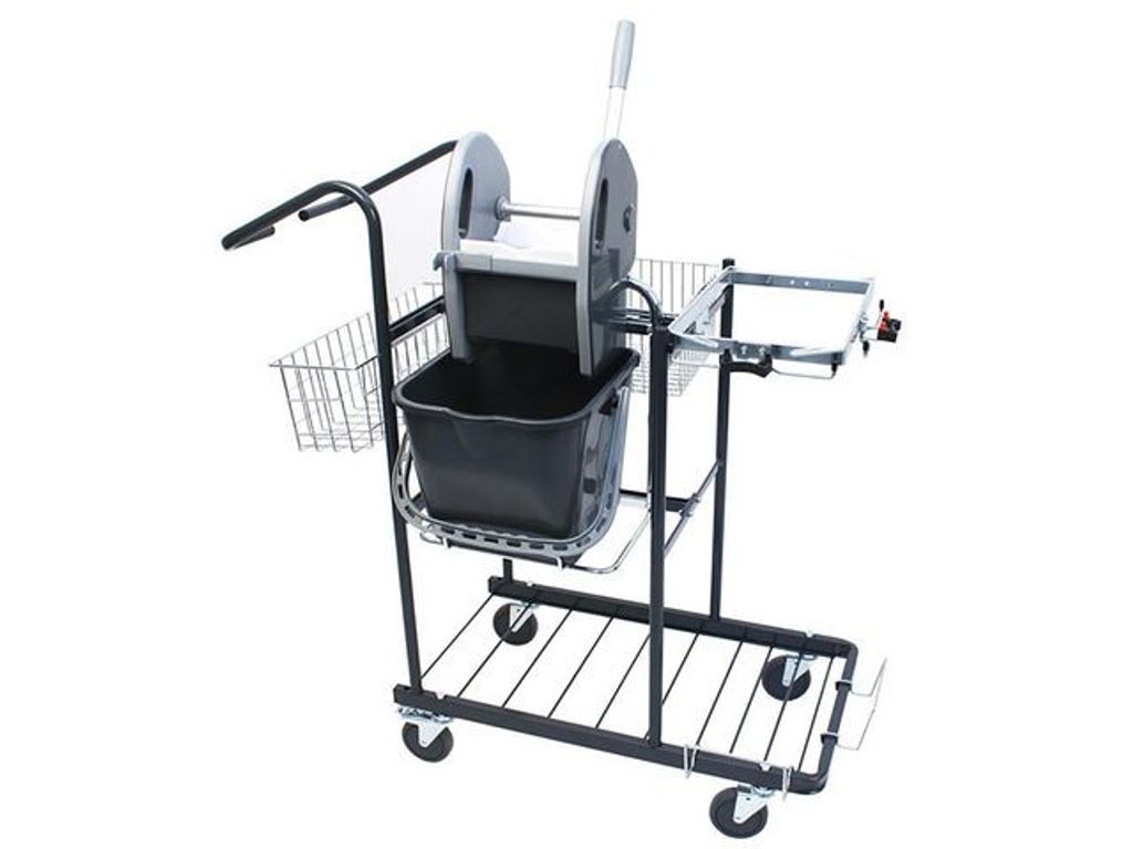 Prisvärd städvagn innehållande svabbpress och materialkorg i arbetshöjd. Samt en lång korg på styret. - Tillbehör: - 125-liters säckhållare - 2 st mopphängare - 2 platser för skaft och stativ - 100 mm kullagrade hjul - Mått (LxBxH): 104x54x112 cm