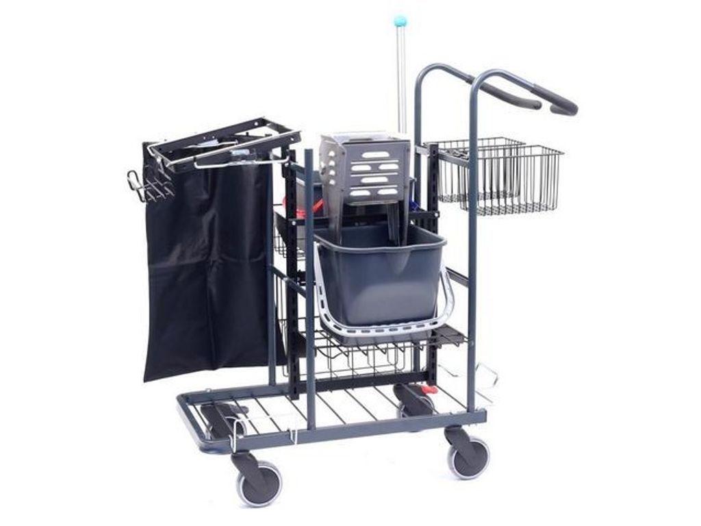 Våtvagn med kraftig press och tillbehör. Innehåller: Handtag med mjuka grepp 1st tvättpåse stor 33L 4st långa krokar 1st specialkorg för 30L säckrulle 2st skafthållare STD med stativhållare och tröskelklättrare 1st trådkorg stor + trådkorg XL 2st trådkorg liten 1st justerbar hylla för svabbutrustning 1st kraftig svabbpressi kompositmaterial 1st plasthink pro15L Säckhållare 125-160L Lättrullade 125mm hjul fram varav ett medtotalbroms och ett med riktningsspärr - Mått: 117 x 6 2x 112cm (L x B x H)