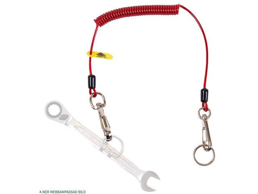 En enkel spiral verktygsäkring tillverkad av PU belagd stålvajer. Flexibel verktygsäkring med stor rörlighet trots sin låga vikt. Med två stycken snäppkrokar och en nyckelring. - Min. läng: 0,5m - Max. längd: 1,6m - Max rekommenderad verktygsvikt: 0,9kg - Brottstyrka: 20kg - Spiral vajer: 1mm (röd PU belagd till 3mm)
