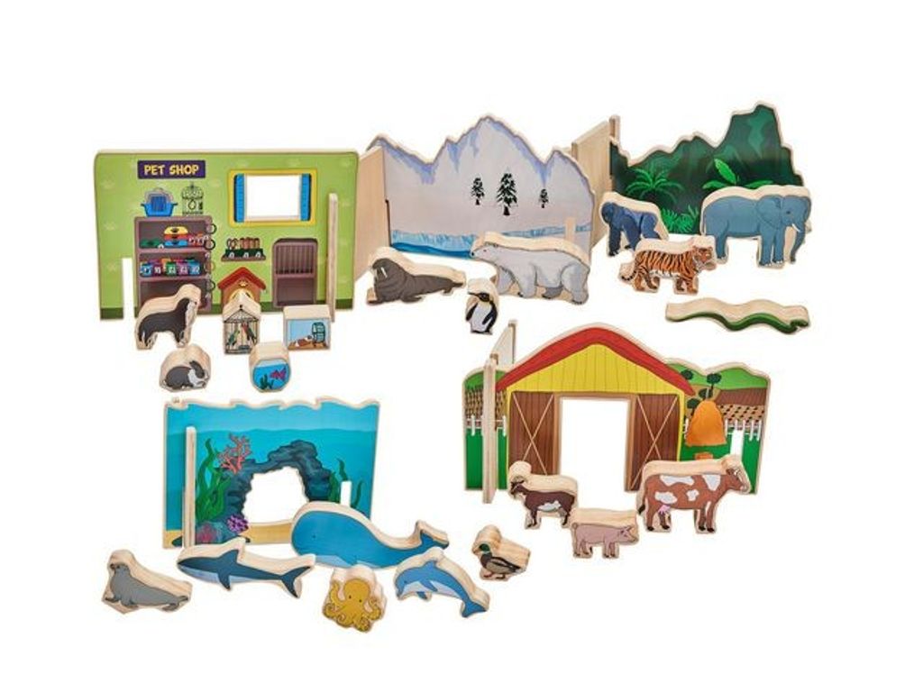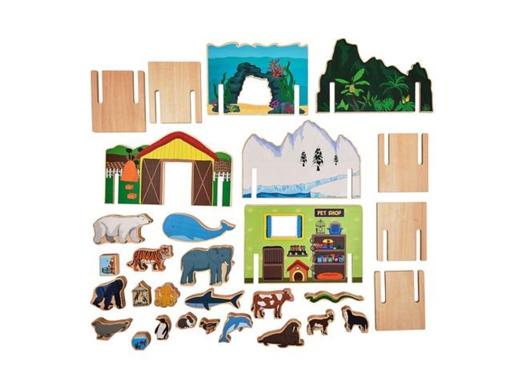 Barn kommer att njuta i timmar av fantasifull lek med dessa vilda djur i trä deras miljöer. Detta set innehåller 30 delar som tillsammans skapar fem olika miljöer. Dessa inkluderar en istäckt polarscen, den asiatiska djungeln, ett undervattenslandskap, en klassisk bondgård och en charmig djuraffär. Tillsammans med många tjocka trädjur som kommer att ge liv till varje scen. Perfekt för att uppmuntra till samtal om var människor och djur hör hemma i världen samt öppna samtal om dynamiken i varje miljö. Designen är tryckt på trä med hjälp av värmeöverföringsteknik för att säkerställa att de håller sig färgglada i många år framöver. - Mått: cirka 30 x 20 cm för den största biten, 5 x 5 cm för den minsta - Material: Nyzeeländsk tall, plywood - FSC-certifierat trä - Antal delar: 30/fp