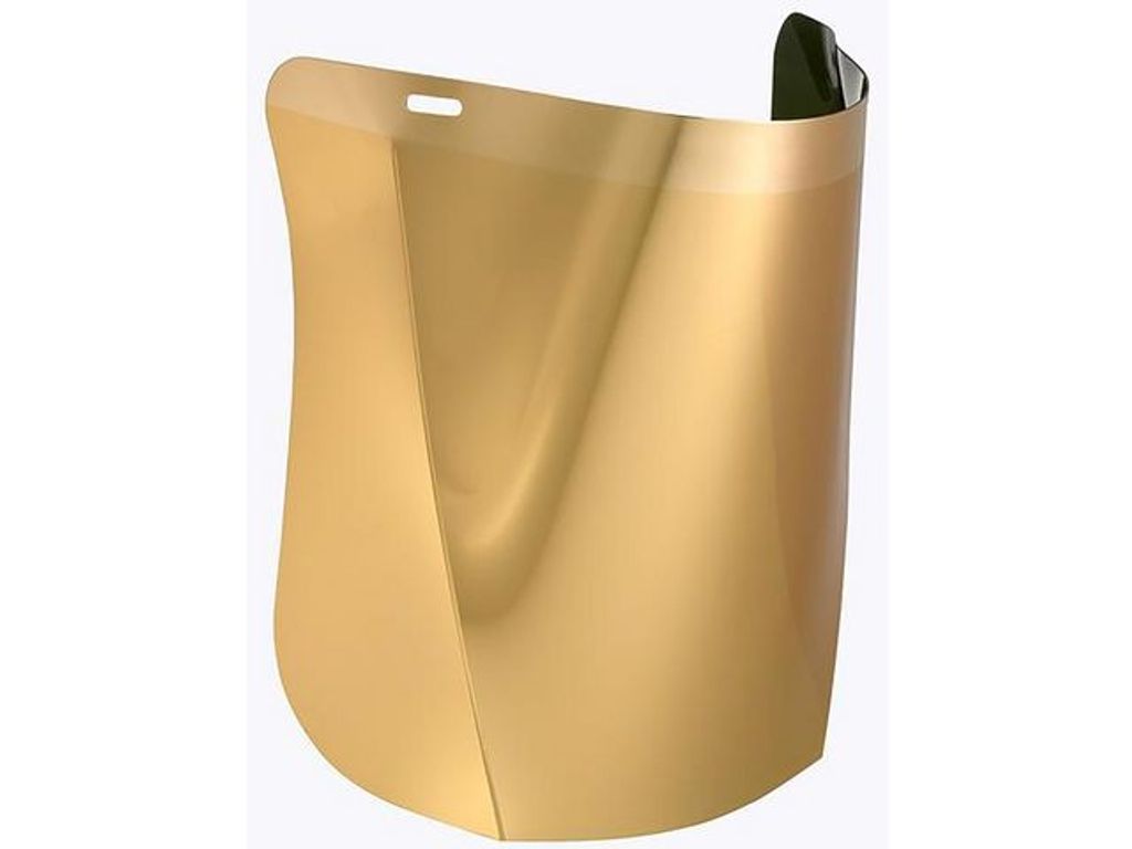 Guldpläterat visir i polykarbonat som reflekterar värme och skyddar mot infraröd strålning, smält metall och skadliga vätskestänk. Visiret är utformat för att kombineras med hörselkåpor, hjälmar och bärare för ett heltäckande skydd ovanför halsen. Visiret är godkänt för stötar och slag med måttlig effekt och lämpar sig för skydd mot strålningsvärme, såsom kortvarig exponering vid öppning av inspektionsluckor in till smältugnar. Guldpläteringen blockerar IR-strålning och reflekterar värme från visirytan. Lämpligt vid övervakning av värmekällor såsom ugnar med smält metall. Ansiktsskyddssystemet monteras enkelt på alla Hellberg hörselskydd samt skyddshjälmar och fristående visirhållare. Och det är lätt att ta bort, perfekt när du växlar mellan olika arbetsuppgifter i bullriga miljöer. Alla Hellbergs visir följer samma form och design, vilket gör att alla visir passar på alla visirhållare. Detta gör det enkelt att byta mellan olika visir för olika arbetsuppgifter utan att du behöver byta bärare. - Överensstämmer med EN 166:2001 - Vikt: 96 g - Längd: 250 mm - Tjocklek: 1 mm