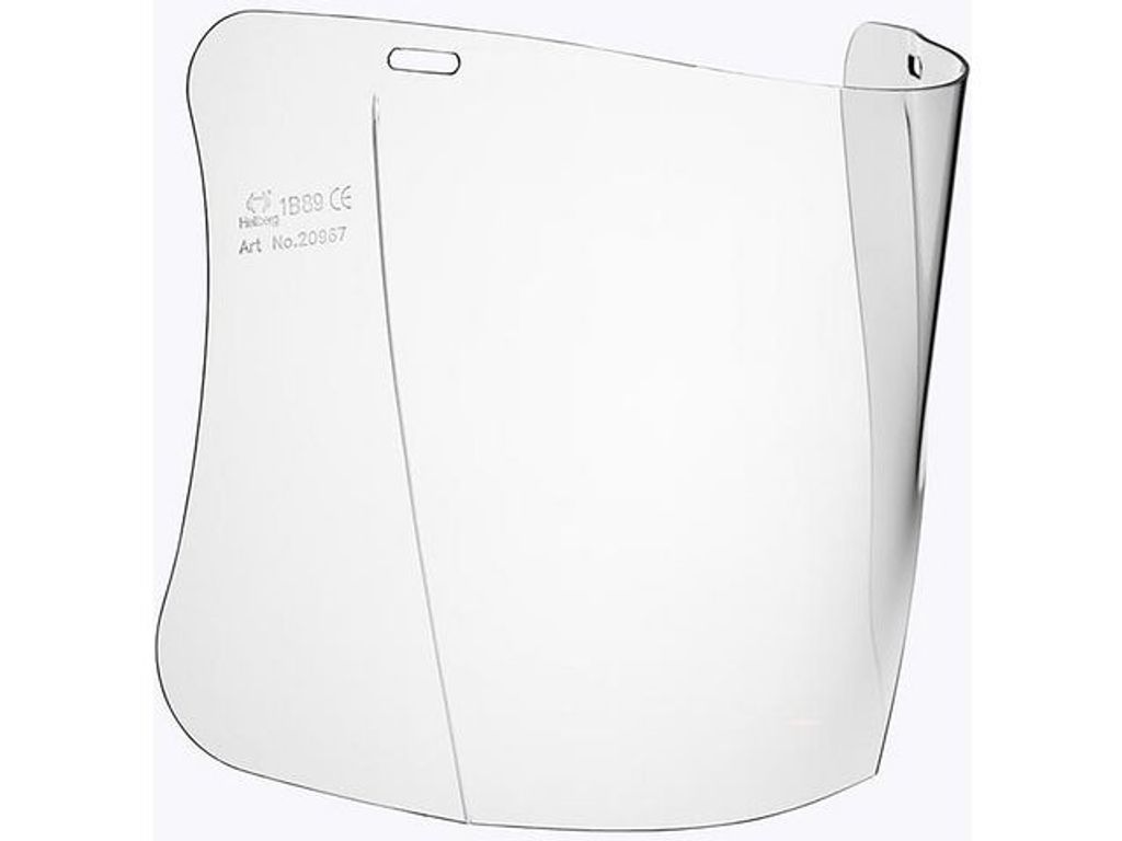 Visir i 1,5mm klar polykarbonat som erbjuder hög slagtålighet och skydd mot ljusbågar upp till 400 volt. Visiret är utformat för att kombineras med hörselkåpor, hjälmar och bärare för ett heltäckande skydd ovanför halsen. Visiret är godkänt för skydd mot stötar och slag med medelhög effekt och lämpar sig för tillämpningar som elarbete och arbete med smält metall. Testad för att erbjuda ett skydd mot stötar till en viss grad, men studera de tekniska uppgifterna för att kontrollera att det uppfyller dina krav på stötskydd. Även testat för att skydda mot vätskestänk och droppar. Det klara polykarbonatet ger en utmärkt optisk klarhet med liten eller ingen ljusspridning. Visiret har ett ljusgenomsläpp (opacitet) på mer än 90 %. Godkänt för att skydda bäraren mot ljusbågar vid kortslutning, upp till 400 volt. Ansiktsskyddssystemet monteras enkelt på alla Hellberg hörselskydd samt skyddshjälmar och fristående visirhållare. Och det är lätt att ta bort, perfekt när du växlar mellan olika arbetsuppgifter i bullriga miljöer. Alla Hellbergs visir följer samma form och design, vilket gör att alla visir passar på alla visirhållare. Detta gör det enkelt att byta mellan olika visir för olika arbetsuppgifter utan att du behöver byta bärare. - Överensstämmer med EN 166:2001 - Vikt: 116 g - Längd: 200 mm - Tjocklek: 1,5 mm
