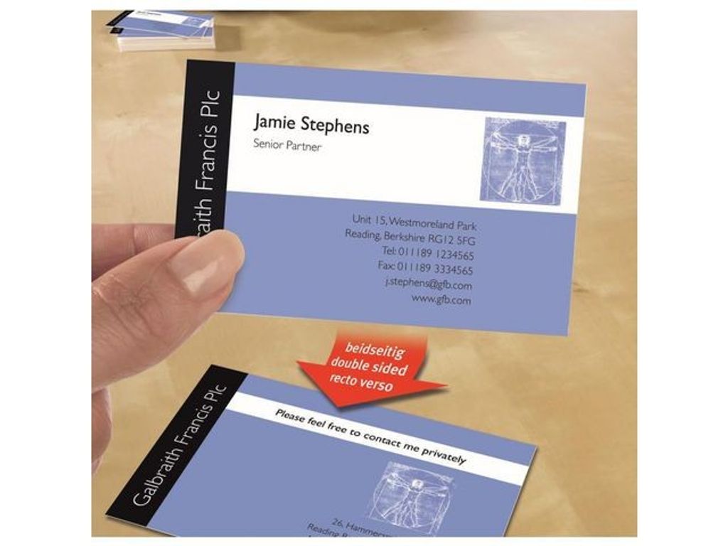 Averys visitkort är det perfekta valet för att designa och skriva ut professionella visitkort. Korten har Quick&Clean-teknik som innebär att de har skarpa kanter och är lätta att avlägsna från arket. De har en matt yta och en gramvikt på 260g. För dubbelsidig utskrift. Passar bra för utskrift med bläck. Designa och skriv ut korten med Averys gratis onlineprogram som du hittar på www.avery.se. - Kortformat: 85 x 54mm - Antal: 10 ark x 8 kort/ark = 80 kort/fp - Kvalitet: 260g