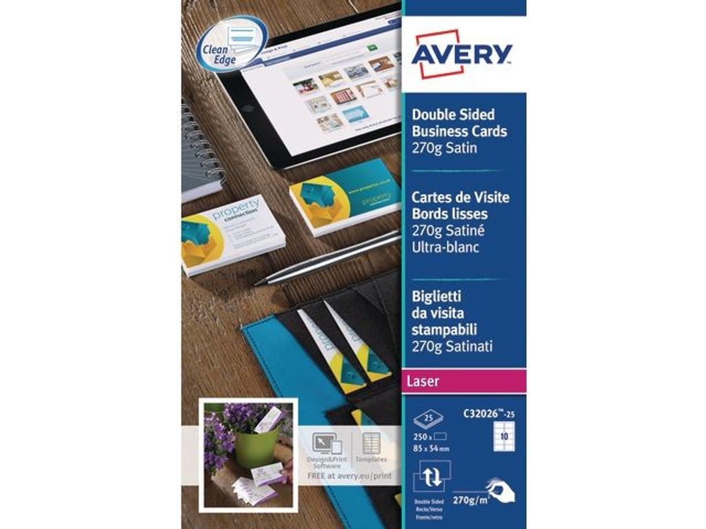 Designa och skriv ut dina egna visitkort i det antal du behöver Flexibelt, ekonomiskt och snabbt! Ny Quick & Clean patenterad teknik som gör att det går enkelt och snabbt att tillverka professionella kort med helt raka kanter Format 85 54 mm. Går att skriva på båda sidorna, förutom 870164 Gratis mallar och programvara till Microsoft® Office kan laddas ner på www.avery.se Passar i: inkjet & laserskrivare Antal per paket: 25 ark